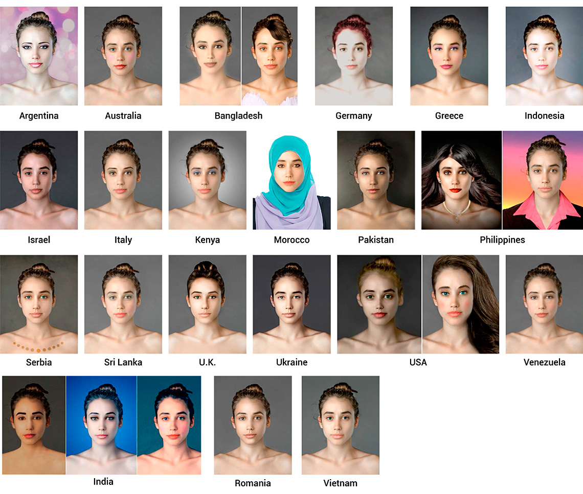 Every country and culture has their own definition of beauty. A recent visual study by Esther Honig, included almost 40 photoshop artists from 25 different countries and shows that beauty really is in they eye of the beholder.