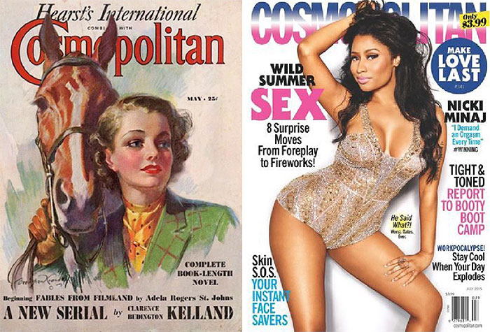 Cosmopolitan covers started out with women dressed conservatively. Then they started showing some skin. Then more skin. Finally, they started posing in sexy positions.